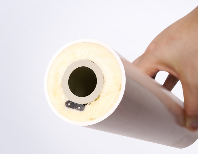 防凍管是由聚乙烯外護(hù)管、聚氨酯泡沫保溫層和塑料工作管(PPR或PE-RT)三部分復(fù)合而成。保溫效果較其他管材提高4-9倍。再有因聚氨酯泡沫的閉孔率高達(dá)92%,因此其吸水率很低。低導(dǎo)熱系數(shù)和低吸水率,加上保溫層和外面防水性能好的聚乙烯管,大大減少了管道的整體熱損耗,熱網(wǎng)熱損失為2%,遠(yuǎn)低于10%的標(biāo)準(zhǔn)要求。另外,防凍管在保溫管的基礎(chǔ)上增加了能量補(bǔ)給功能,保證流體不凍結(jié)。