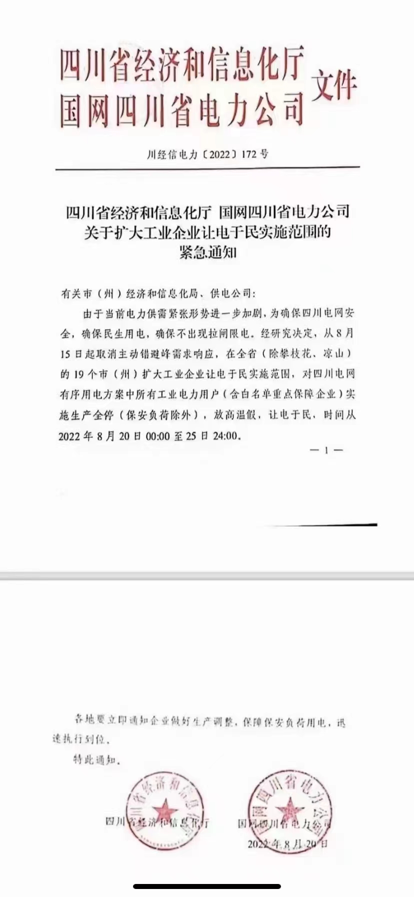 由于今年四川的氣溫超過自1961年來有完整氣象記錄的最高溫,且持續(xù)時間長,再加上降雨量與同期相比大幅減少,水電豐富的川渝地區(qū)遭遇嚴峻的電力供給緊張局面挑戰(zhàn)。原計劃于8月20日結(jié)束的限電停產(chǎn)計劃因高溫天氣持續(xù)、供電負荷緊張,由省經(jīng)信廳和國網(wǎng)四川電力公司于8月20日再次發(fā)布川經(jīng)信電力【2022】172號文件,要求工業(yè)企業(yè)繼續(xù)限電停產(chǎn)讓電于民,時間從8月20日00:00-25日24:00。